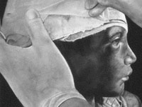 An American flag-draped coffin “crashes” through a gallery wall. A monstrous skeletal figure – assembled from bullets, grenades, and artillery shells – haunts one gallery. There are mild-mannered abstractions and generic photos of American troops patrolling Iraq. A video documents a Providence anti-Iraq war street protest. Milton Stevenson creates a mandala of “Support Our Troops” ribbon auto magnets. A couple of artists pulp veterans’ uniforms to turn them into paper.